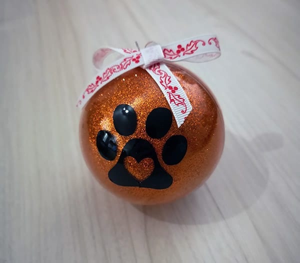 A glitter Christmas bauble with a black pawprint on it. Different colours of glitter are available. Please get in touch before buying to see what colours are in stock.