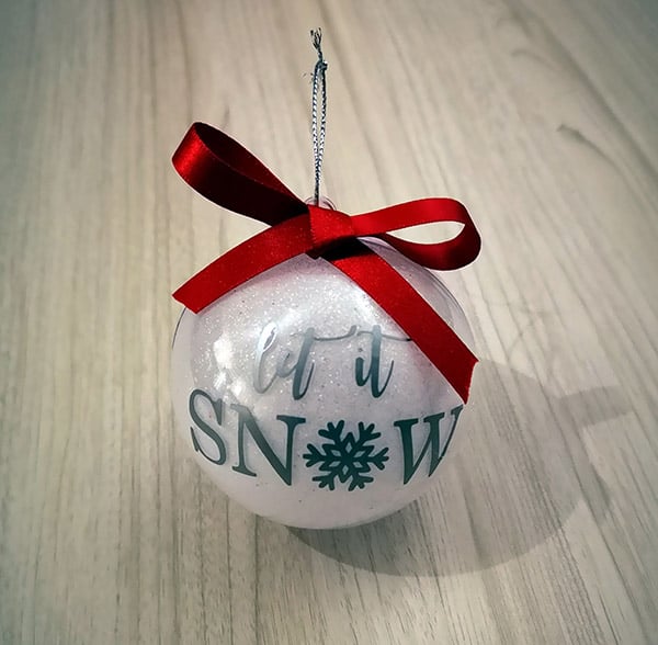 A glitter Christmas bauble with “Let It Snow” on it. Different colours of glitter are available. Please get in touch before buying to see what colours are in stock.