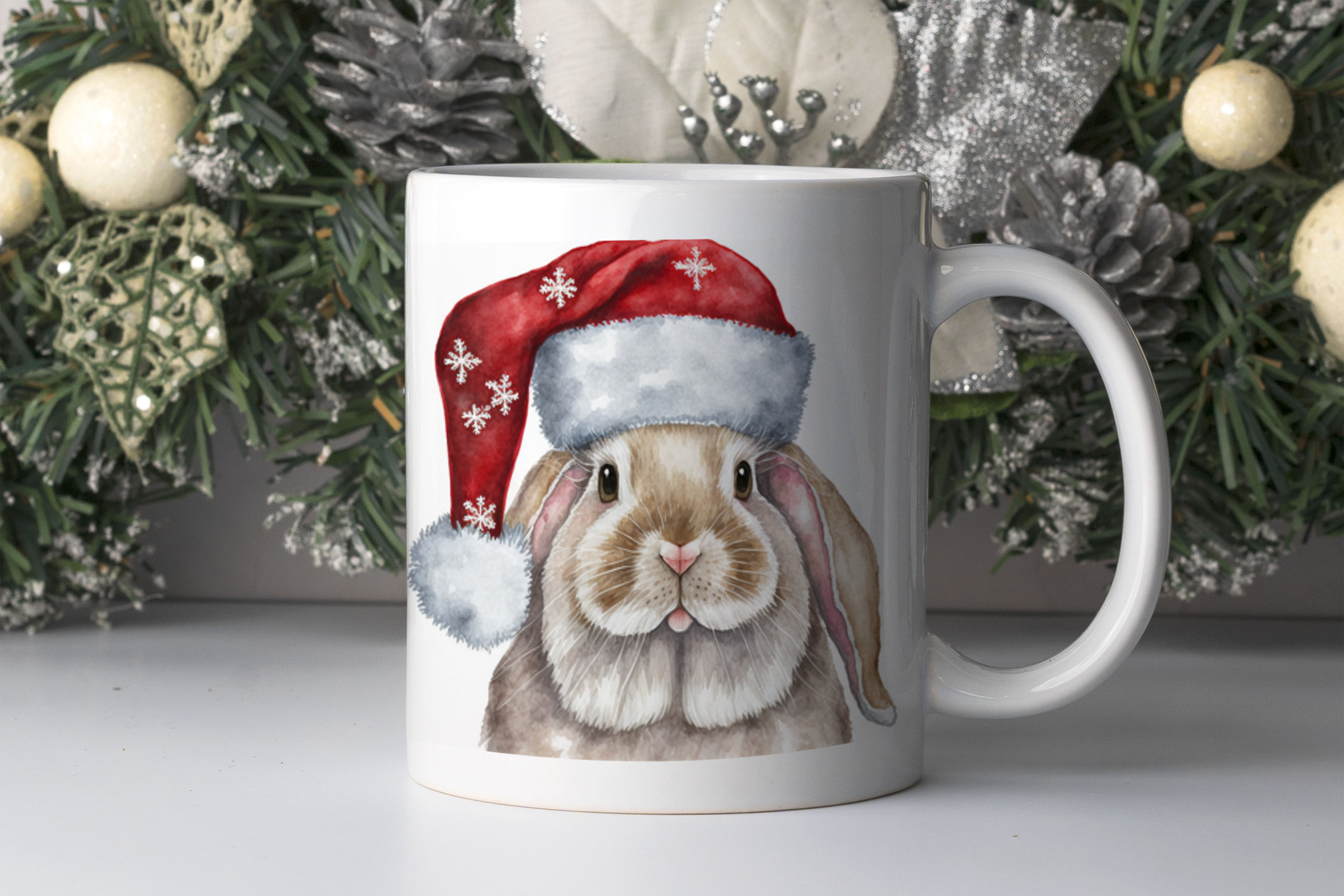 A mug with a cute lop-eared bunny wearing a Santa hat designed on it.