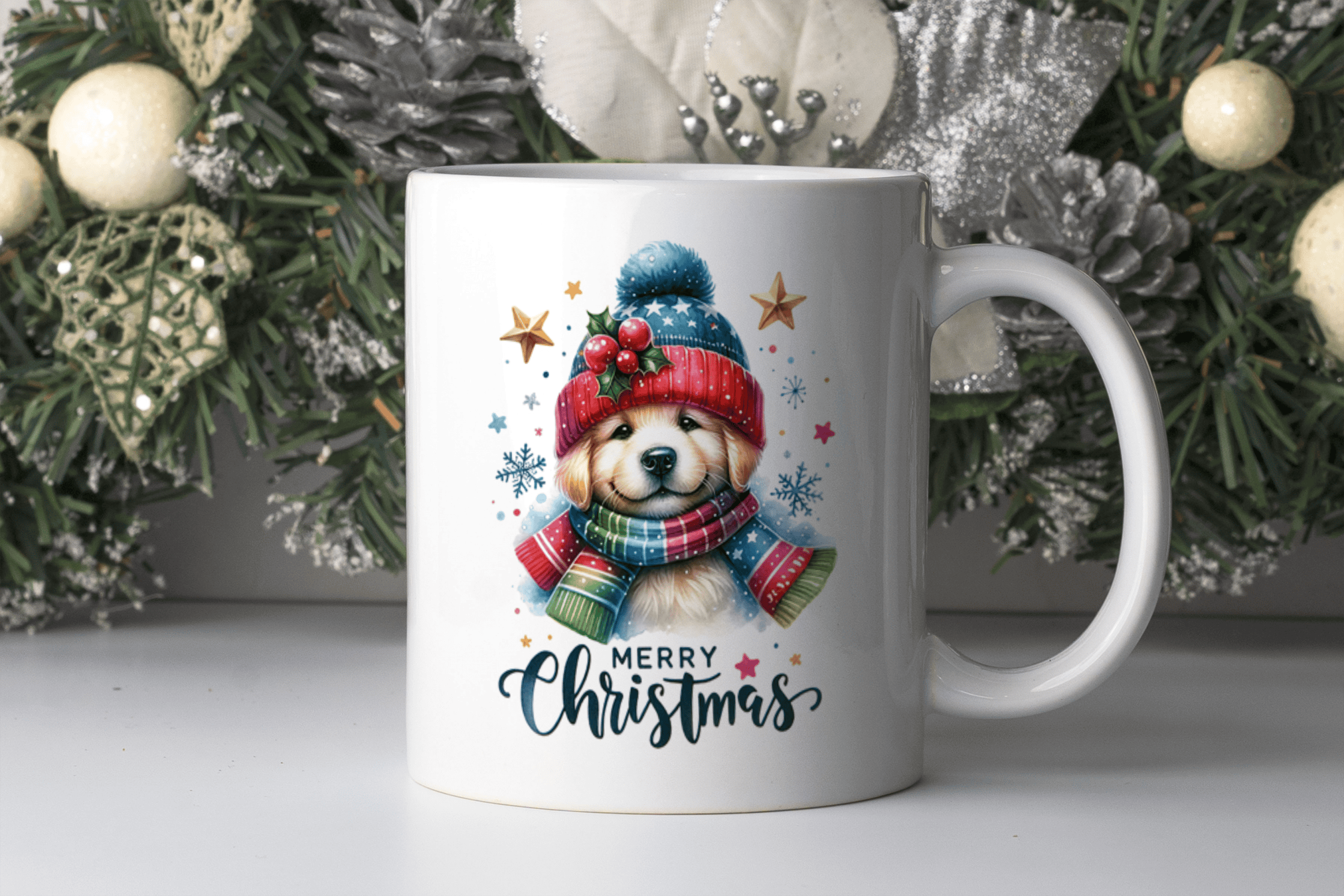 A mug with Golden Retriever in a woolly hat with “Merry Christmas” message.